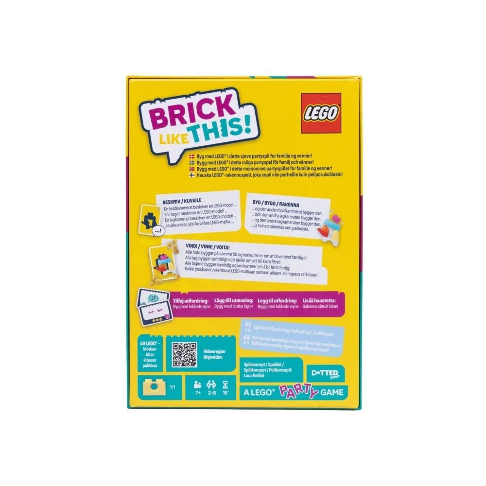 Brick Like This! er et fartsfylt, teambasert LEGO partyspill som utfordrer kommunikasjons- og byggeferdighetene dine under press. I hver runde danner spillerne par som instruktører og byggere for å gjenskape en skjult LEGO modell. Men det er en vri - byggeren kan ikke se formen og må stole helt og holdent på partnerens instruksjoner for å bygge den og det raskt!